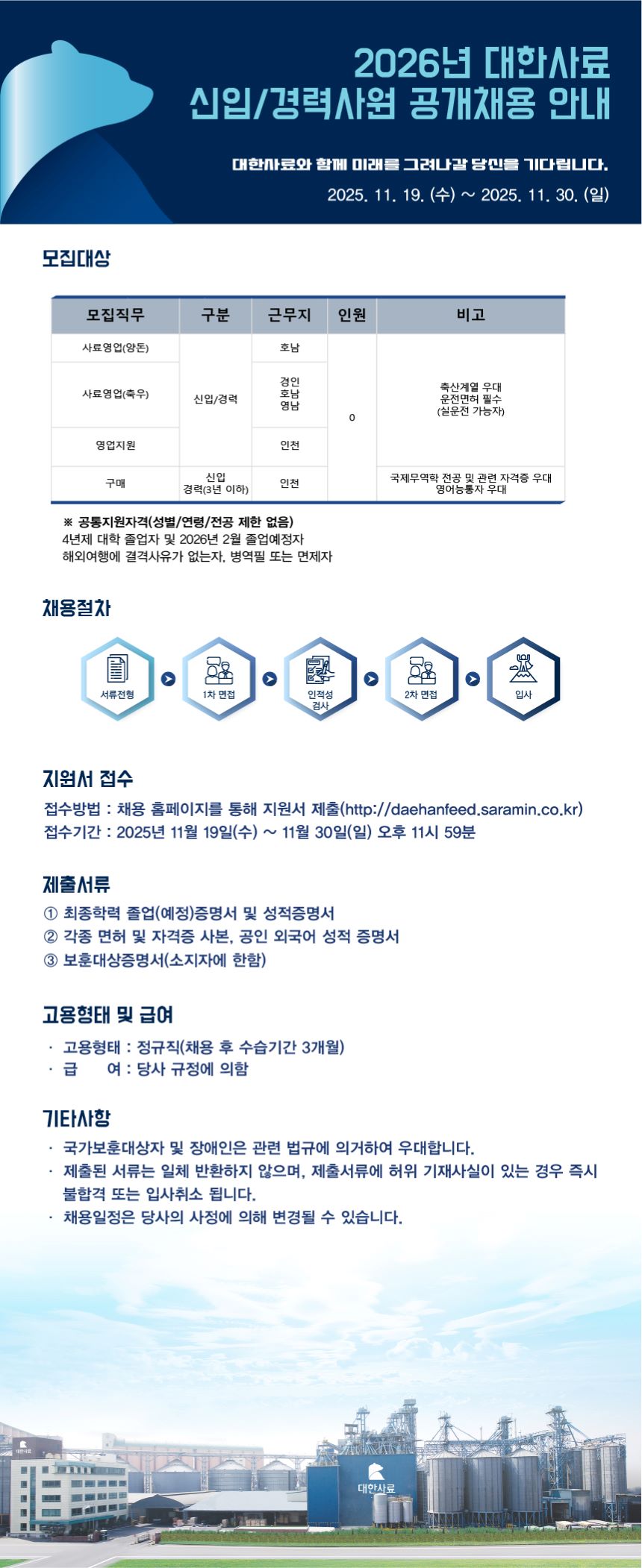 2026년 대한사료 상반기 신입/경력사원 모집안내
